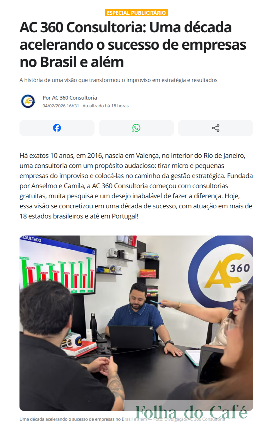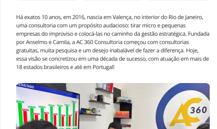 Valença - A AC 360 Consultoria foi destaque em um dos maiores portais de notícias do Brasil. O reconhecimento chega em um momento simbólico na trajetória da empresa, que completa dez anos de atuação em 2026. Fundada em 2016, na cidade de Valença, no interior do Rio de Janeiro, a consultoria nasceu com um propósito claro: Tirar micro e pequenas empresas do improviso e conduzi-las ao caminho da gestão estratégica.